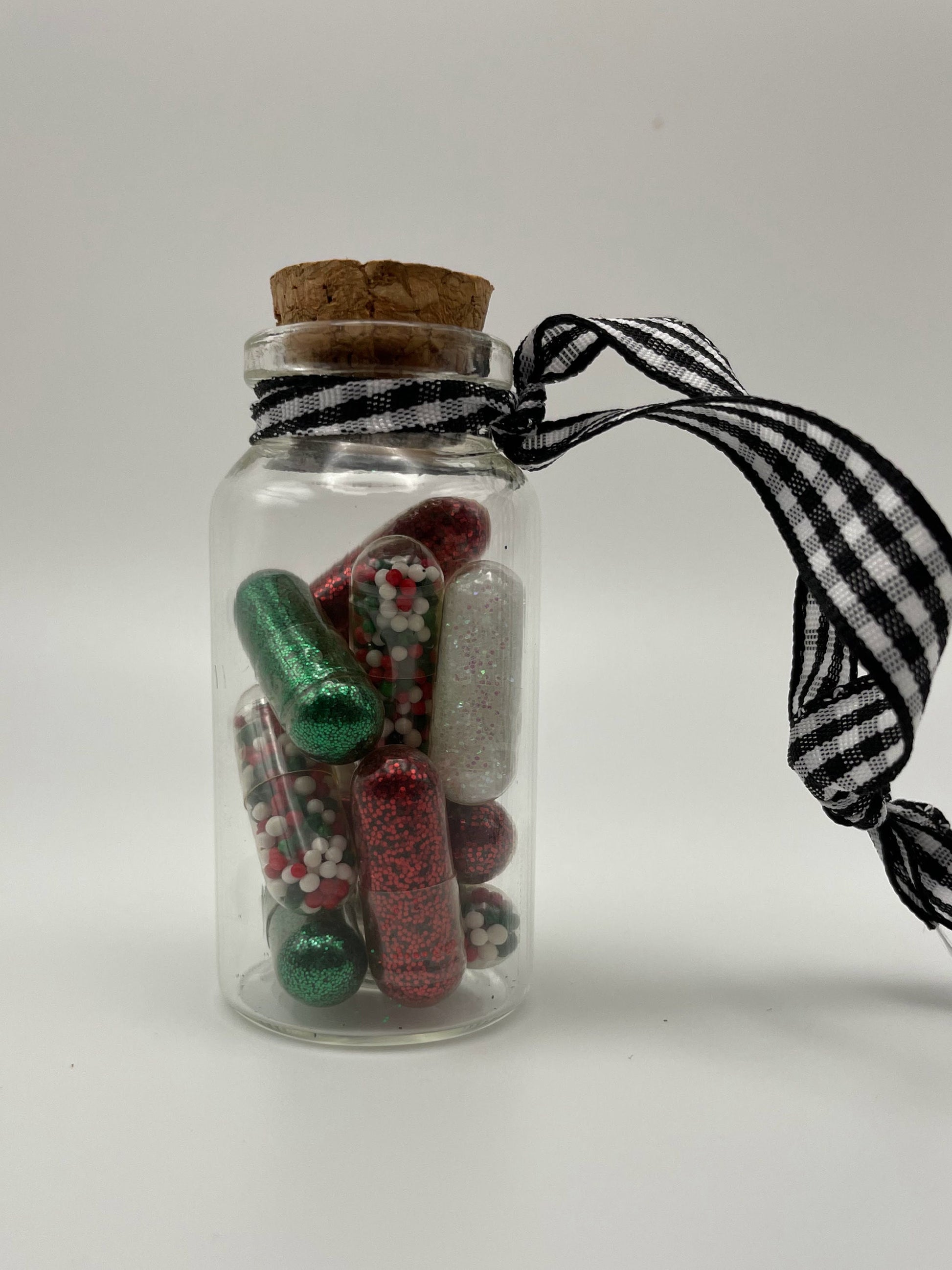 This adorable ornament is a 20 mL glass bottle including gelatin medicine capsules filled with glitter and sprinkles.