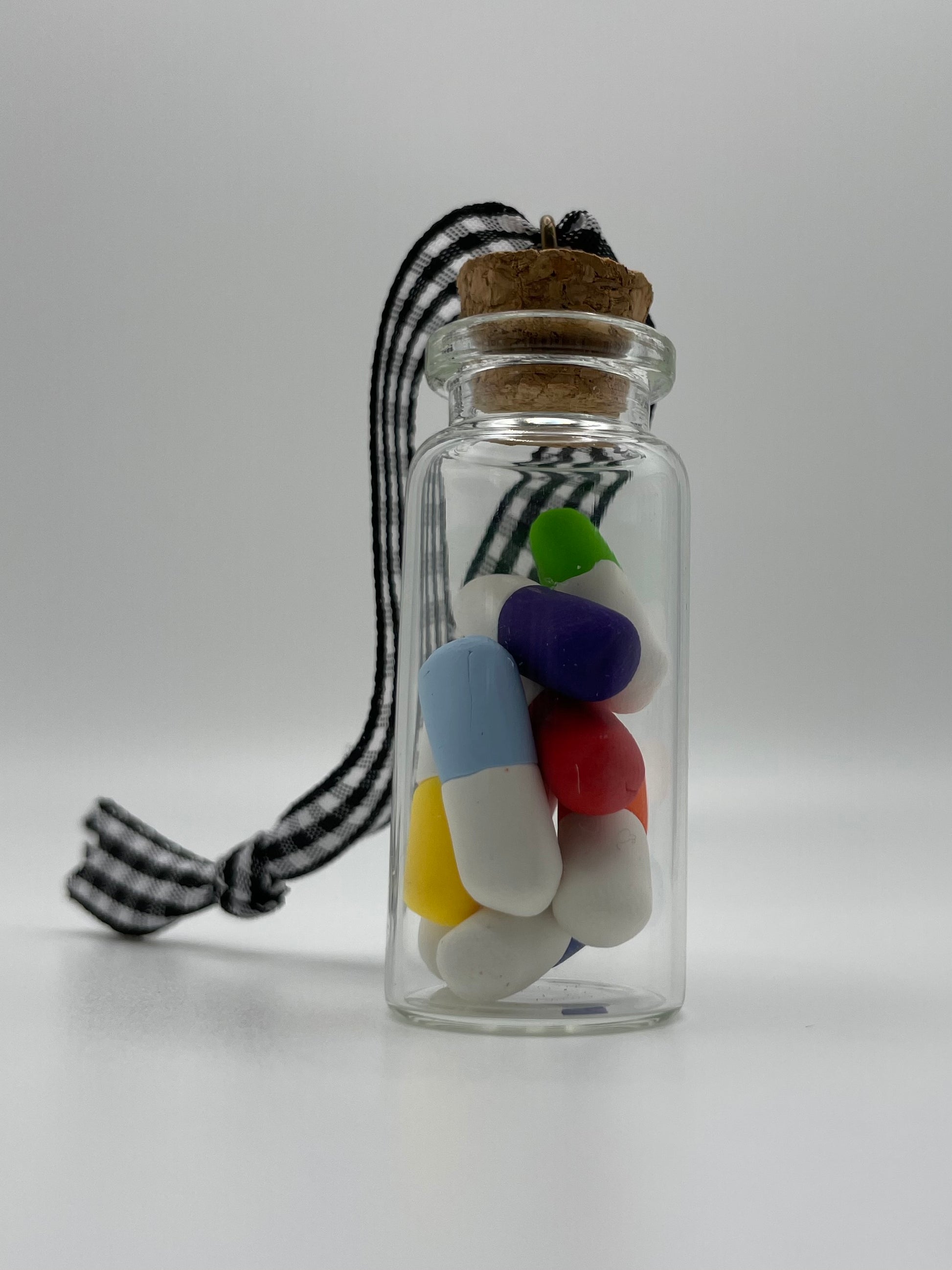 Add a tiny dose of adorable charm to your décor with this Handmade Clay Medicine Bottle Ornament. Each glass bottle is filled with miniature life-like polymer clay capsules, sculpted and painted by hand for a fun, playful look. Choose whether you’d like your capsules with kawaii faces for extra cuteness — or without for a clean, realistic style.