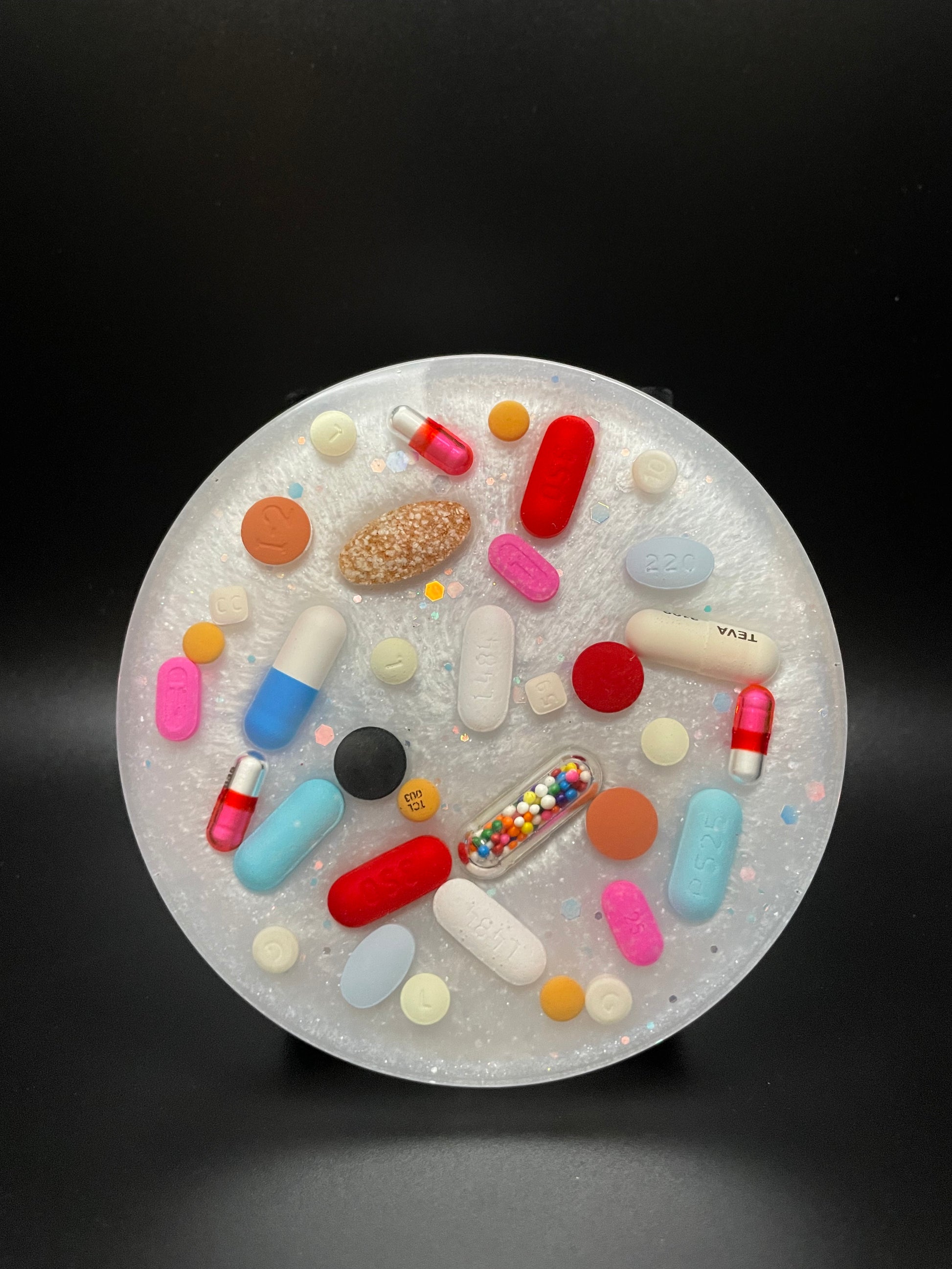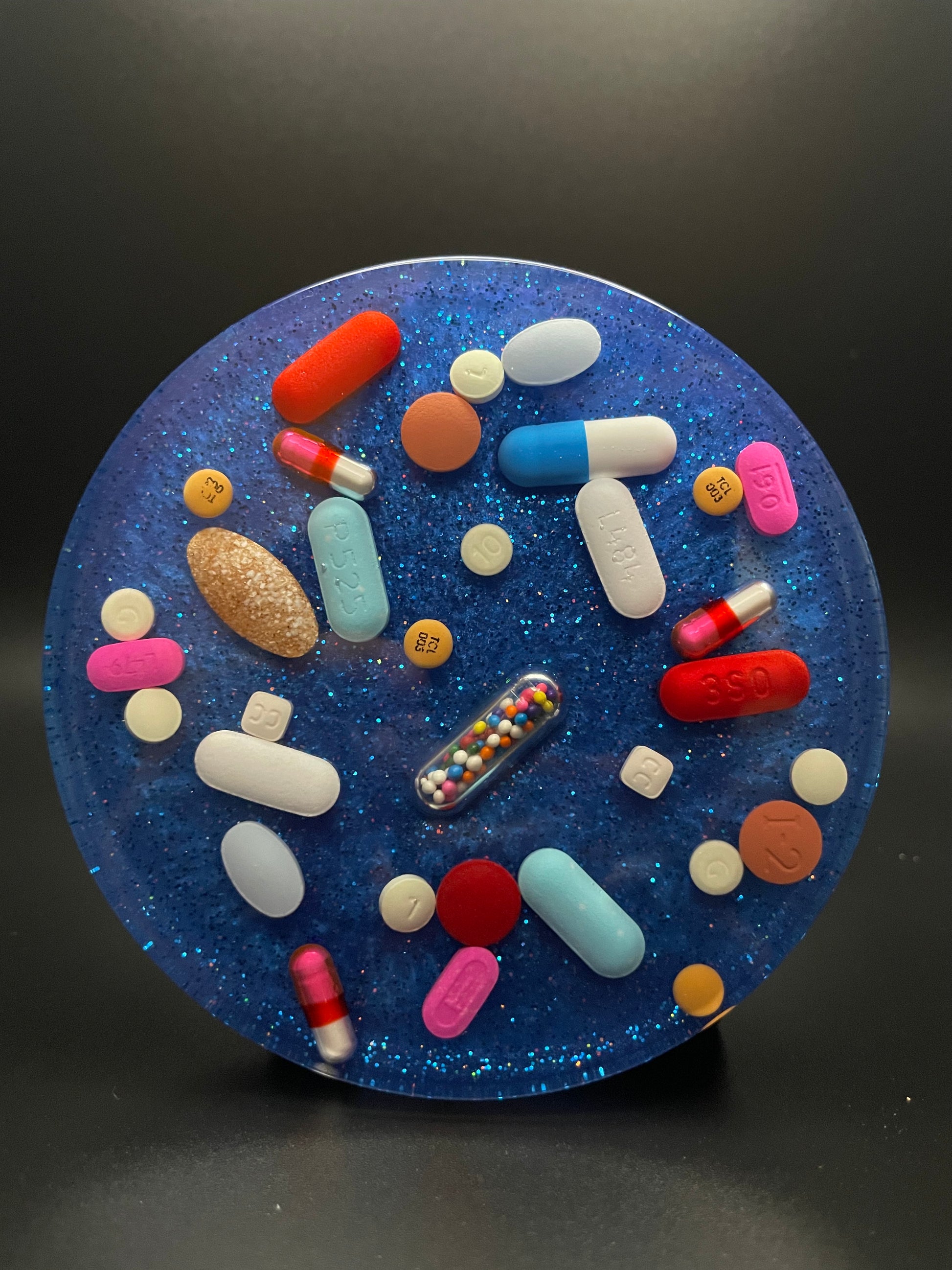 Bring a splash of science-inspired style to your table or workspace with this Handmade Round Resin Medicine Coaster. Real over-the-counter pills and capsules are arranged inside a circular mold and sealed in crystal-clear epoxy resin, creating a vibrant, modern design with tons of visual interest.