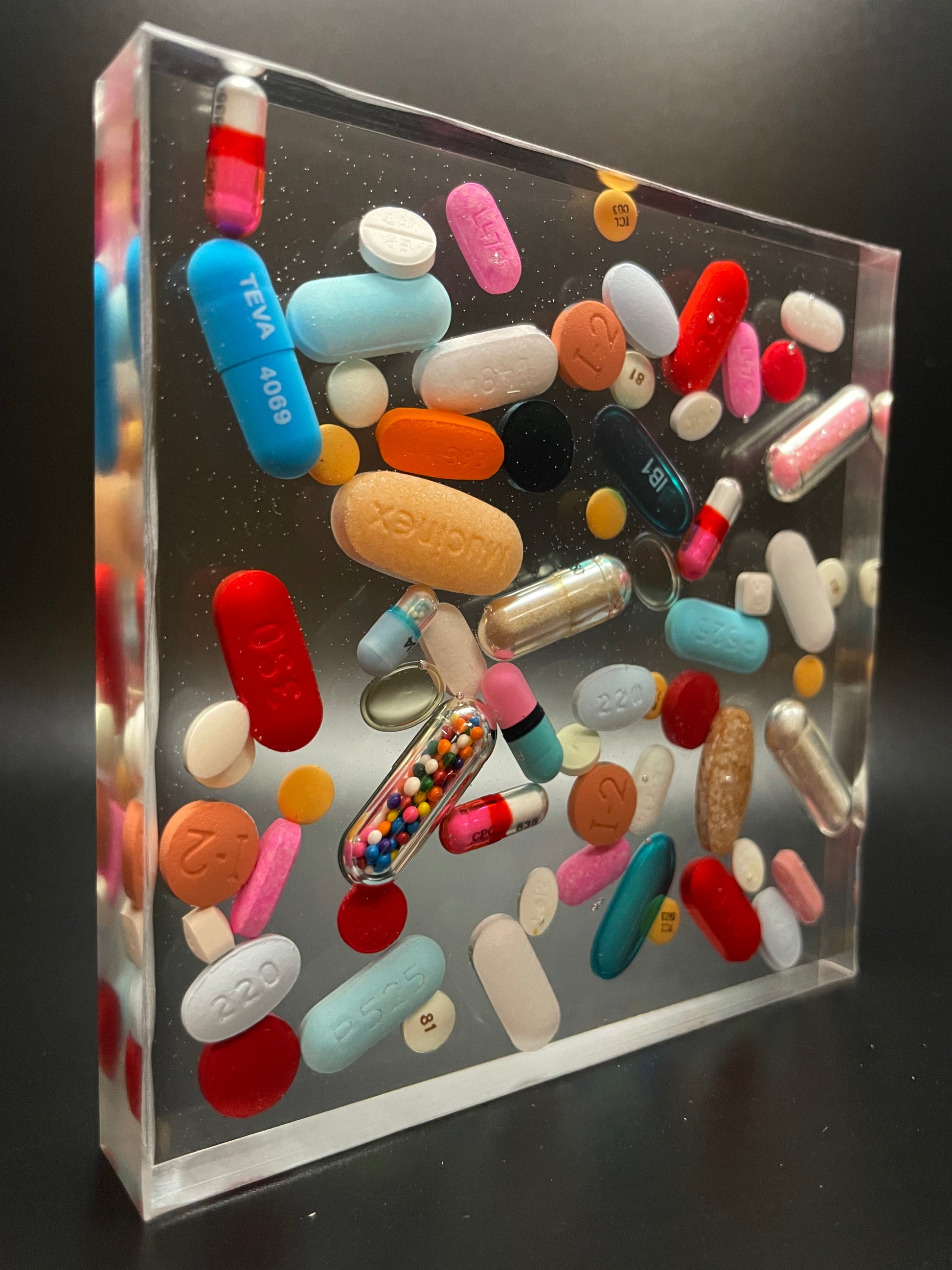 Make a bold statement on your desk or coffee table with this Handmade Resin Medicine Paperweight/Coaster. Real over-the-counter medications, glitter-filled capsules, and sprinkle-filled capsules are arranged inside a square mold and cast in clear epoxy resin, resulting in a vibrant and eye-catching piece with tons of personality.