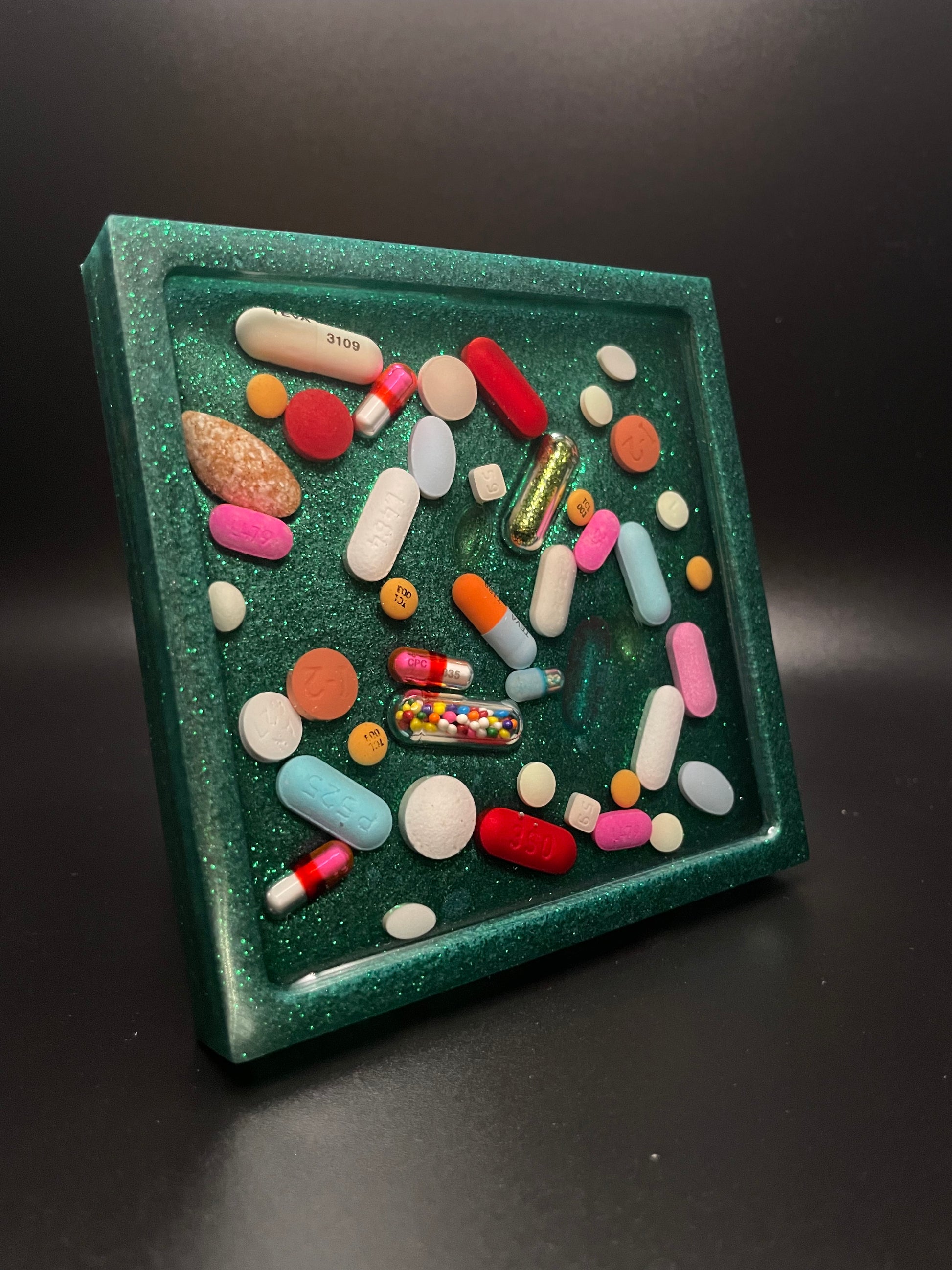 Bring a bold, eye-catching statement piece to your space with this Handmade Resin Medicine Coaster. This square coaster is poured by hand using crystal-clear epoxy, featuring real over-the-counter pills and capsules suspended inside a glossy, dark glitter background. The result is a modern, science-inspired piece with tons of visual interest.