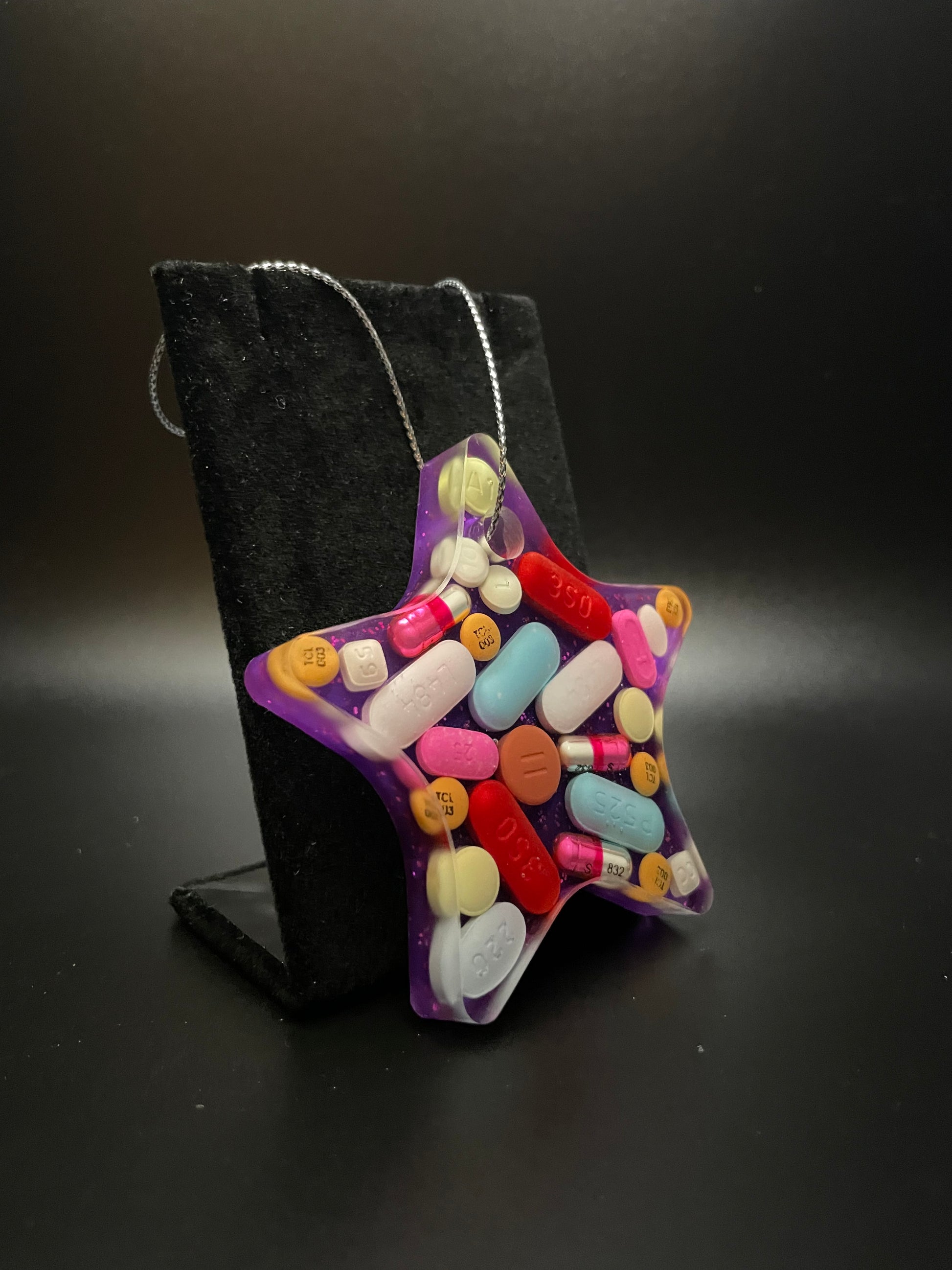 The star silhouette makes this ornament perfect for holiday trees, office displays, backpacks, rearview mirrors, or all-year décor. Each piece is hand-poured, and the pill arrangement is placed individually, giving every star its own unique personality and color pattern.